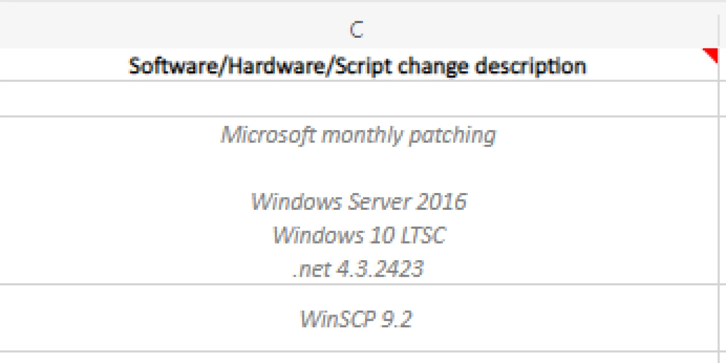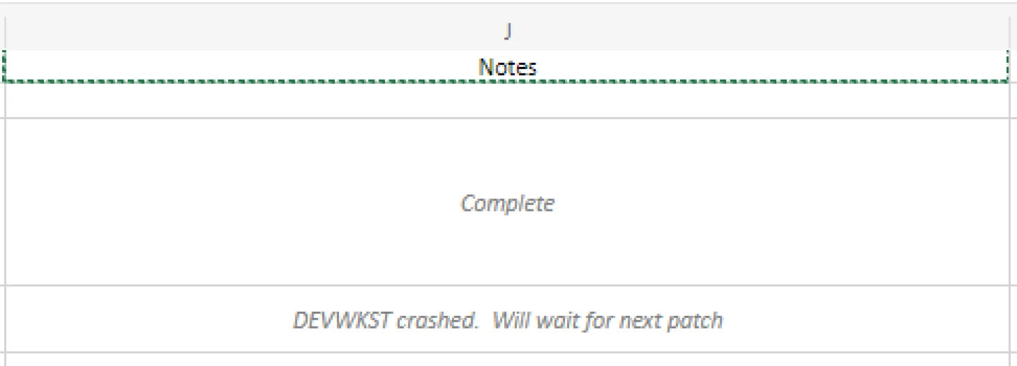 This cell will contain any pertinent information about the change beyond what is already required in other cells. In the example below, there’s a short note as to why a change was not completed, which was due to the test workstation crashing. This cell could include other information such as who did the patching if they weren’t the Change Manager, if user accounts/password were modified, or a vendor ticket opened for support.