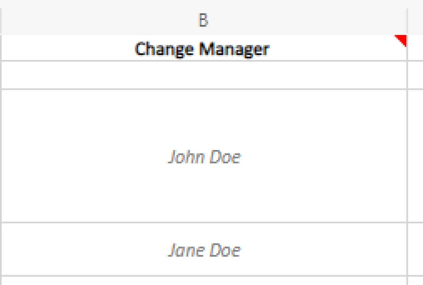 Below are examples of the attributes we recommend you track as part of your change management program. We’ve also included an example workflow of the change management process, who’s involved, and how the change management tracker is used throughout the entire process.