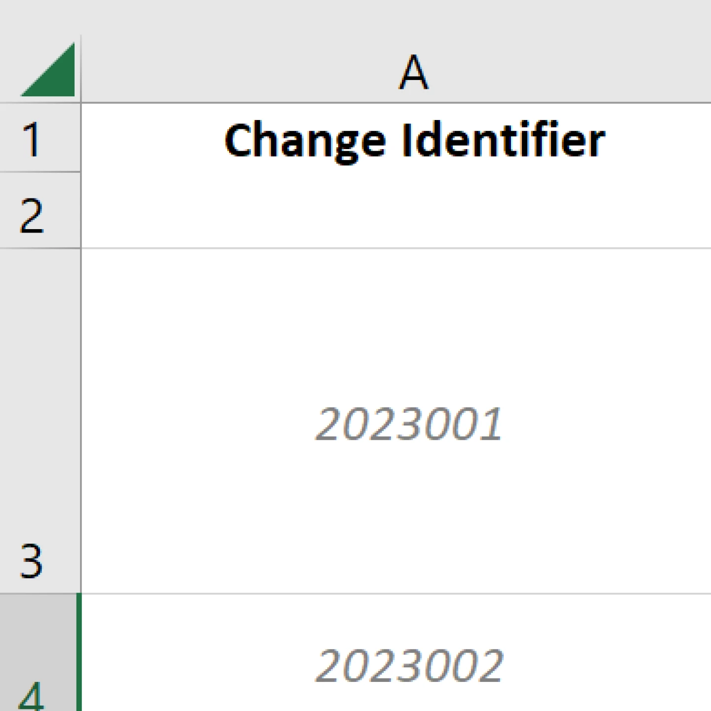 This is the unique identifier for a change. This can be numbers, alphanumeric, or anything else. The purpose of this is to easily identify a change utilizing a unique identifier, like a Primary Key in a SQL database. Keep in mind that it is possible to have several changes logged on the same date, changes that only affect half of the servers, and different software requirements on different machines, for example. In the example below, we used the year the change was opened and then a sequential order. You could also use YearMonthDate and sequential number. (Eg. 2023APR3210001.) The only limit is from Excel at 32,767 characters per cell 😁.